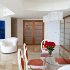 7. Un dessin en verreCette magnifique double porte coulissante, composée de deux pans en verre opalin dans lesquels un arbre se détache en transparence, sépare la salle à manger du salon avec une élégance rare.