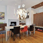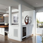 5. Le verre : transparent, opaque ou sérigraphiéÀ San Francisco, ce grand séjour moderne est séparé d’un petit salon cosy à l’aide d’une porte coulissante en applique composée de deux vantaux. Le rail apparent est fixé au mur car il s’agit de portes en verre, trop lourdes pour une fixation au sol. Opaques, elles sont décorées de manière élégante avec des motifs d’arbres transparents permettant une connexion visuelle entre les deux espaces.