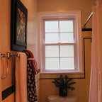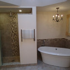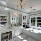 We utilized a Moroccan inspired mirror to accentuate and play with the unusual slanted roof line. By adding clean lines and ample drawers for storage, we were able to transform this outdated bathroom into a true modern master retreat.