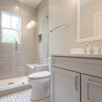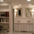 Cette photo montre une salle de bain principale chic de taille moyenne avec un placard avec porte à panneau encastré, des portes de placard blanches, une douche à l'italienne, un WC séparé, un carrelage blanc, un carrelage métro, un mur blanc, un sol en marbre, un lavabo encastré, un plan de toilette en marbre, un sol blanc, une cabine de douche à porte battante et un plan de toilette blanc. — Houzz