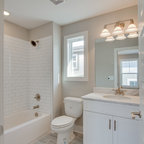 Cette image montre une salle de bain principale traditionnelle de taille moyenne avec des portes de placard blanches, un mur blanc, un sol en marbre, un lavabo encastré, un plan de toilette en marbre, un sol blanc, un placard en trompe-l'oeil et un plan de toilette gris. — Houzz
