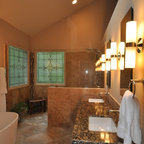 We utilized a Moroccan inspired mirror to accentuate and play with the unusual slanted roof line. By adding clean lines and ample drawers for storage, we were able to transform this outdated bathroom into a true modern master retreat.