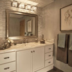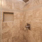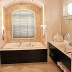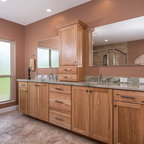 We utilized a Moroccan inspired mirror to accentuate and play with the unusual slanted roof line. By adding clean lines and ample drawers for storage, we were able to transform this outdated bathroom into a true modern master retreat.