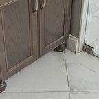 Cette photo montre une salle de bain principale chic de taille moyenne avec un placard avec porte à panneau encastré, des portes de placard blanches, une douche à l'italienne, un WC séparé, un carrelage blanc, un carrelage métro, un mur blanc, un sol en marbre, un lavabo encastré, un plan de toilette en marbre, un sol blanc, une cabine de douche à porte battante et un plan de toilette blanc. — Houzz