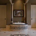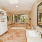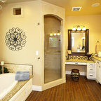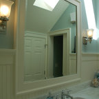We utilized a Moroccan inspired mirror to accentuate and play with the unusual slanted roof line. By adding clean lines and ample drawers for storage, we were able to transform this outdated bathroom into a true modern master retreat.