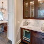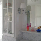 Cette photo montre une salle de bain principale chic de taille moyenne avec un placard avec porte à panneau encastré, des portes de placard blanches, une douche à l'italienne, un WC séparé, un carrelage blanc, un carrelage métro, un mur blanc, un sol en marbre, un lavabo encastré, un plan de toilette en marbre, un sol blanc, une cabine de douche à porte battante et un plan de toilette blanc. — Houzz