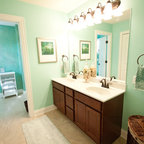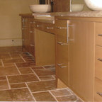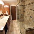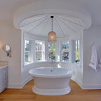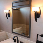 We utilized a Moroccan inspired mirror to accentuate and play with the unusual slanted roof line. By adding clean lines and ample drawers for storage, we were able to transform this outdated bathroom into a true modern master retreat.