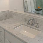 Idées déco pour une salle de bain principale classique de taille moyenne avec un placard avec porte à panneau encastré, des portes de placard blanches, une douche à l'italienne, un WC séparé, un carrelage blanc, un carrelage métro, un mur blanc, un sol en marbre, un lavabo encastré, un plan de toilette en marbre, un sol blanc, une cabine de douche à porte battante et un plan de toilette blanc. — Houzz