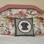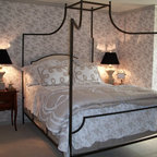 Like the side table and bed color (Very neutral and not too yellow) Also like the bench at the end of the bed. Like the modern lamp with the traditional beside table. Love the play of patterns and textures on the pillows.