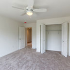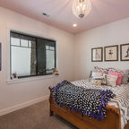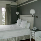 Idée de décoration pour une grande chambre tradition avec un mur gris et un sol gris. — Houzz
