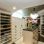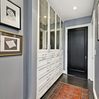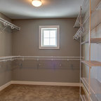 Cette image montre un dressing traditionnel de taille moyenne avec un placard à porte shaker, des portes de placard blanches, moquette et un sol gris. — Houzz