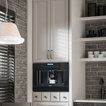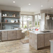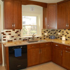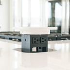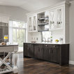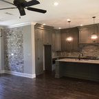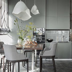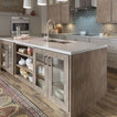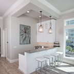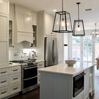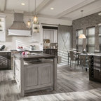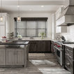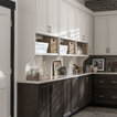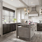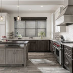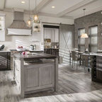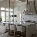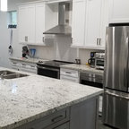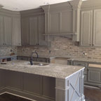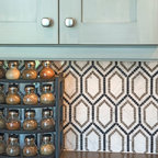Réalisation d'une arrière-cuisine tradition en L de taille moyenne avec un évier encastré, un placard à porte shaker, des portes de placard grises, un plan de travail en quartz modifié, une crédence blanche, une crédence en carreau de ciment, un électroménager en acier inoxydable, un sol en carrelage de porcelaine et un îlot central. — Houzz