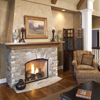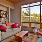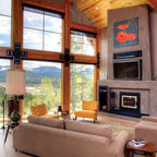 love how the TV is out as far as the fireplace and then the shelving and window are set back.