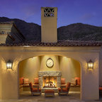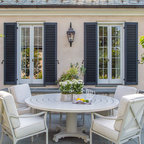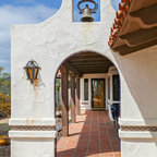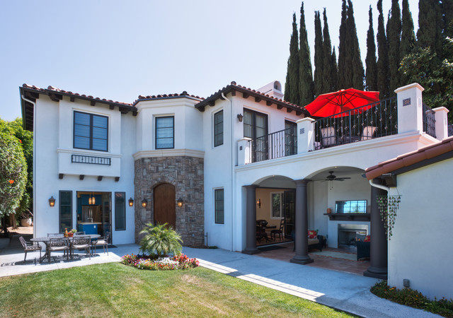 This covered patio is attached to the house, and has an upstairs deck right above it. This is a new home designed and built in the Los Feliz area of Los Angeles. Grecian columns and arched entryways compliment the modern Mediterranean theme throughout.