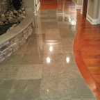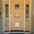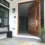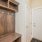 Idée de décoration pour une entrée design avec un mur gris et un sol en bois foncé. — Houzz