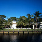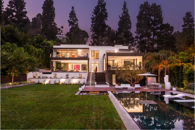 Exemple d'une très grande façade de maison blanche moderne à niveaux décalés avec un revêtement en stuc et un toit plat. — Houzz
