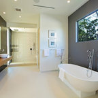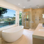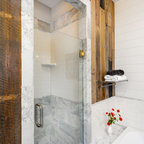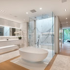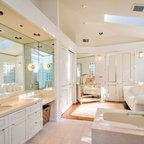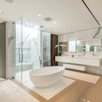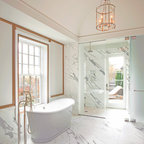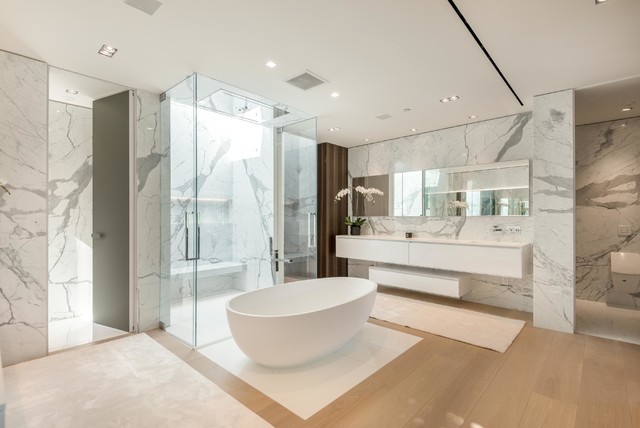 Cette image montre une très grande douche en alcôve principale design avec un placard à porte plane, des portes de placard blanches, une baignoire indépendante, un carrelage blanc, du carrelage en marbre, un mur blanc, un lavabo encastré et un plan de toilette en marbre. — Houzz