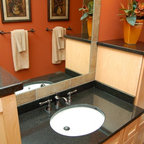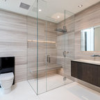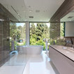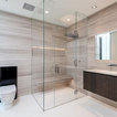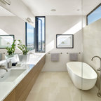 Floating flat panel vanity, slab backsplash to the ceiling behind the mirrors.