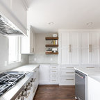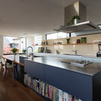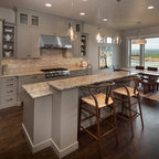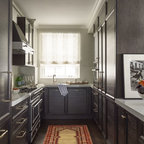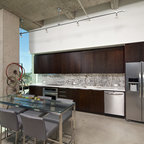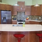 Cette photo montre une grand cuisine américaine linéaire chic avec un évier posé, un placard à porte shaker, des portes de placard en bois sombre, un plan de travail en stratifié, une crédence multicolore, une crédence en carreau briquette, un électroménager en acier inoxydable, une péninsule, un sol marron et un plan de travail beige. — Houzz