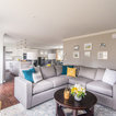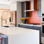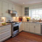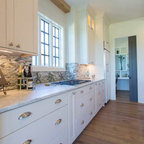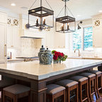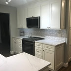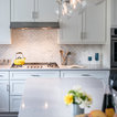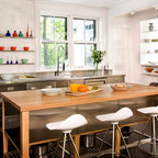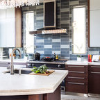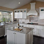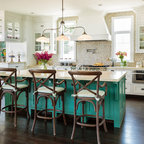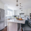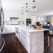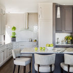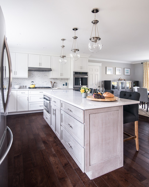 Exemple d'une grand cuisine ouverte chic en L avec un évier posé, un placard à porte shaker, des portes de placard blanches, un plan de travail en quartz, une crédence blanche, une crédence en mosaïque, un électroménager en acier inoxydable, un sol en bois foncé et un îlot central. — Houzz