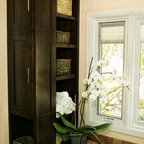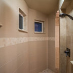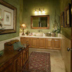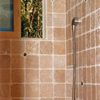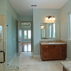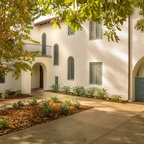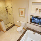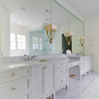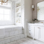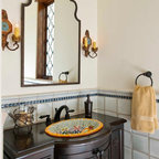 Exemple d'une grande douche en alcôve principale méditerranéenne avec un lavabo encastré, un placard à porte shaker, des portes de placard blanches, un plan de toilette en marbre, une baignoire posée, un WC séparé, un carrelage bleu, des carreaux de céramique, un mur blanc et un sol en carrelage de céramique. — Houzz