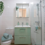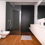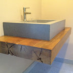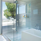 Exemple d'une salle d'eau tendance avec des portes de placard en bois brun, une douche ouverte, un carrelage beige, des carreaux de porcelaine, un mur beige, un sol en carrelage de porcelaine, un sol gris, aucune cabine, un plan de toilette blanc, un placard à porte plane et une vasque. — Houzz
