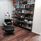 Réalisation d'une grande salle de séjour avec une bibliothèque ou un coin lecture urbaine avec un mur orange, béton au sol, aucune cheminée et aucun téléviseur. — Houzz