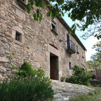 Réalisation d'une grande façade en pierre marron chalet à niveaux décalés avec un toit en appentis. — Houzz