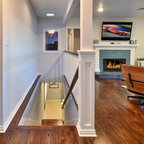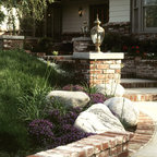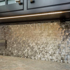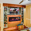 This Shadow Hills, CA. home was enhanced with a fully remodeled kitchen and family room, thus creating a completely new layout. The master bathroom was remodeled with custom tile designs, the laundry room remodeled, and the powder bathroom converted to a ¾ bath. The equestrian motif in the kitchen features a horse mural backsplash above the sink and a glass china cabinet with horse statuettes. The built-in TV in the kitchen has an electric ribbon fireplace below it with a brick surround and custom shelving on each side. The island top and kitchen countertops are light brown quartz, coordinating with the custom beige and brown backsplash tiles. There is a convenient slide-out microwave drawer in the kitchen island. The floor is brown stained concrete and the red brick colored commercial stove is a beautiful and functional addition.