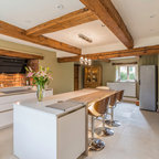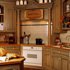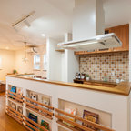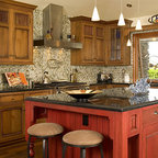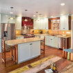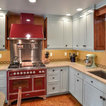 Remodel of kitchen – Shadow Hills/L.A. CA. This Shadow Hills, CA. home was enhanced with a fully remodeled kitchen and family room, thus creating a completely new layout. The equestrian motif in the kitchen features a horse mural backsplash above the sink and a glass china cabinet with horse statuettes. The built-in TV in the kitchen has an electric ribbon fireplace below it with a brick surround and custom shelving on each side. The island top and kitchen countertops are light brown quartz, coordinating with the custom beige and brown backsplash tiles. There is a convenient slide-out microwave drawer in the kitchen island. The floor is brown stained concrete and the red brick colored commercial stove is a beautiful and functional addition.