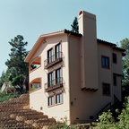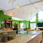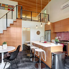 Here is a unique tall chair that serves as a kitchen island bar stool in this newly remodeled home in Shadow Hills, CA. The medium colored wood surrounds a multi-colored fabric seat.