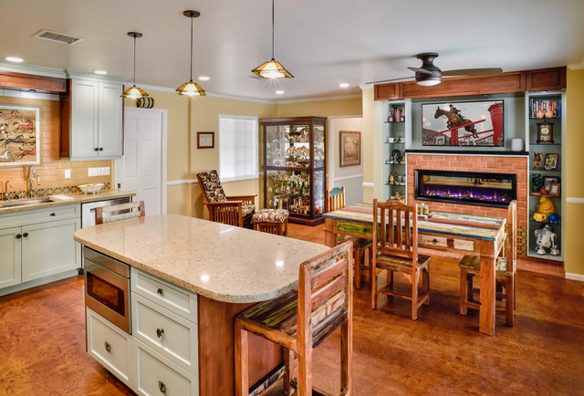 Home remodel in Shadow Hills, CA. The equestrian motif in the kitchen features a horse mural backsplash above the sink and a glass china cabinet with horse statuettes. The built-in TV in the kitchen has an electric ribbon fireplace below it with a brick surround and custom shelving on each side. The island top and kitchen countertops are light brown quartz, coordinating with the custom beige and brown backsplash tiles. There is a convenient slide-out microwave drawer in the kitchen island. The floor is brown stained concrete and the red brick colored commercial stove is a beautiful and functional addition.