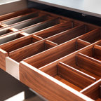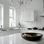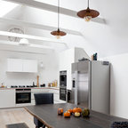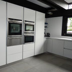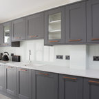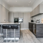 Exemple d'une cuisine tendance en L de taille moyenne avec un évier encastré, des portes de placard grises, une crédence blanche, une crédence en marbre, un électroménager en acier inoxydable, un sol en bois foncé, un îlot central, un sol marron et un plan de travail blanc. — Houzz