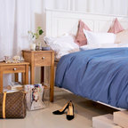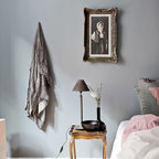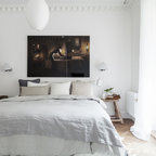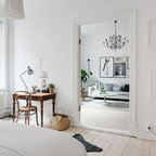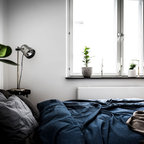 Aménagement d'une chambre parentale scandinave de taille moyenne avec un mur gris et un sol en bois clair. — Houzz