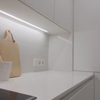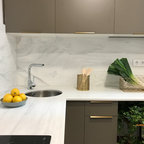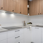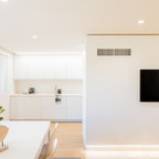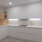 Exemple d'une cuisine ouverte parallèle scandinave de taille moyenne avec un placard à porte plane, des portes de placard blanches, une crédence blanche, une crédence en carrelage métro et un électroménager blanc. — Houzz
