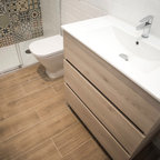 Idée de décoration pour une salle de bain principale méditerranéenne de taille moyenne avec une vasque, un placard à porte plane, des portes de placard beiges, une baignoire indépendante, un mur blanc, un sol en bois brun et un sol marron. — Houzz