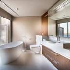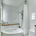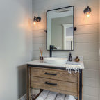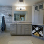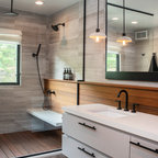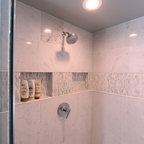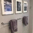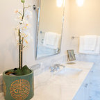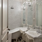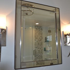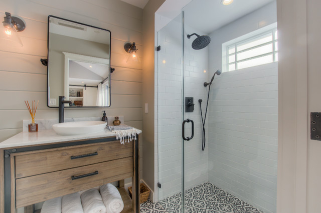 This beautiful bathroom features cement tiles (from Cement Tile Shop) on the floors with an infinity drain a custom frameless shower door and custom lighting. Vanity is Signature Hardware, and mirror is from Pottery Barn.