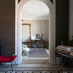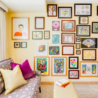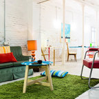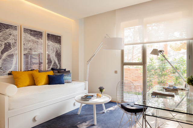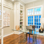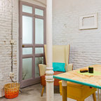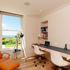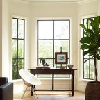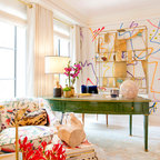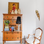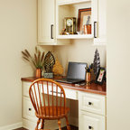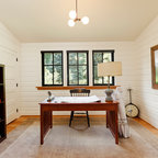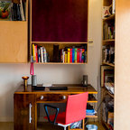 Cette image montre un petit bureau bohème avec un mur beige, un sol en bois clair, aucune cheminée et un bureau indépendant. — Houzz