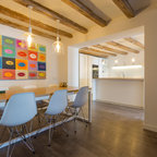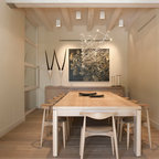 Cette image montre une salle à manger ouverte sur la cuisine design de taille moyenne avec un mur blanc, un sol en bois brun et aucune cheminée. — Houzz