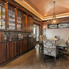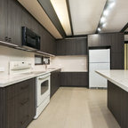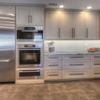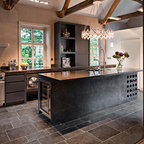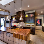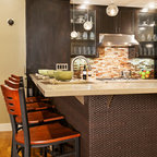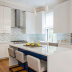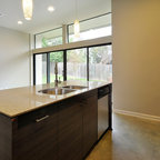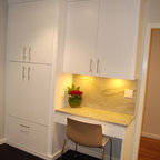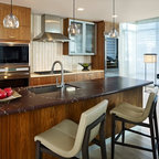 Idée de décoration pour une cuisine américaine design en U de taille moyenne avec un évier encastré, un placard à porte plane, des portes de placard marrons, un plan de travail en marbre, une crédence blanche, une crédence en marbre, un électroménager en acier inoxydable, un sol marron et un sol en bois brun. — Houzz