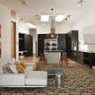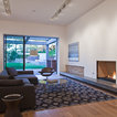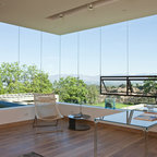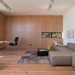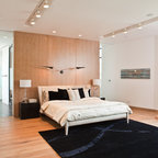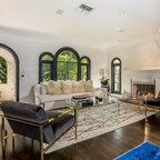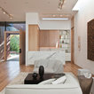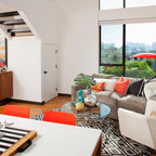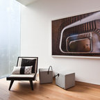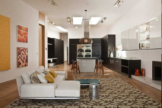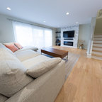 Aménagement d'un grand salon contemporain avec un mur blanc et un sol en bois clair. — Houzz