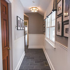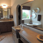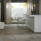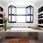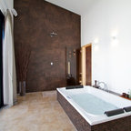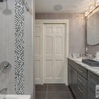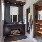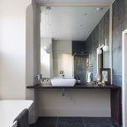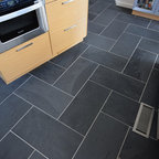 charcoal floors, glass shower door no lip. CM; CM: WE LIKE HOW THE LIPLESS SHOWER ALLOWS FOR EXTENSION OF FLOORING STRAIGHT THROUGH BUT WONDER HOW YOU CREAT THE SLOPE TOWARD THE DRAIN AND ALSO -- DO THESE LIPLESS SHOWERS LEAK? WE'VE EXPERIENCED LEAKING IN HOTELS WITH THIS SET UP. ,