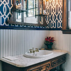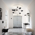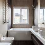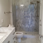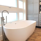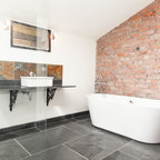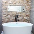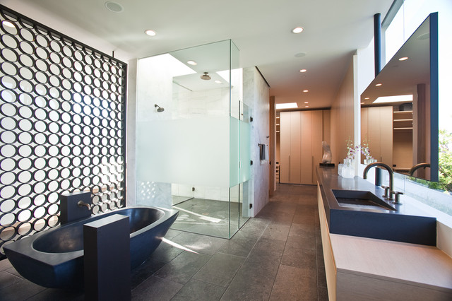 Exemple d'une grande salle de bain principale tendance avec un lavabo intégré, un placard à porte plane, des portes de placard en bois clair, un plan de toilette en granite, une baignoire indépendante, une douche à l'italienne, un WC à poser, un carrelage blanc, un carrelage de pierre, un mur blanc et un sol en ardoise. — Houzz
