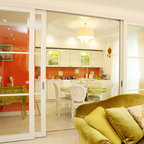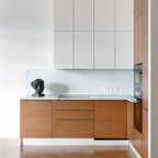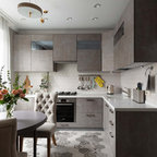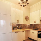 Exemple d'une petite cuisine ouverte tendance en U avec un évier posé, un placard avec porte à panneau encastré, des portes de placard blanches, un plan de travail en bois, une crédence blanche, un électroménager blanc, un plan de travail marron et un sol multicolore. — Houzz