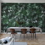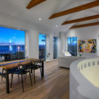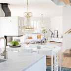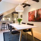 Exemple d'une grande salle à manger ouverte sur la cuisine tendance avec un mur blanc et un sol en bois peint. — Houzz