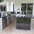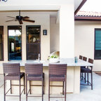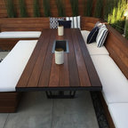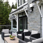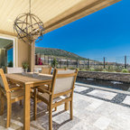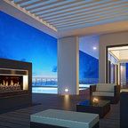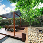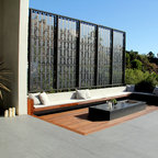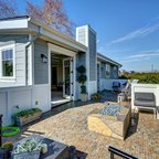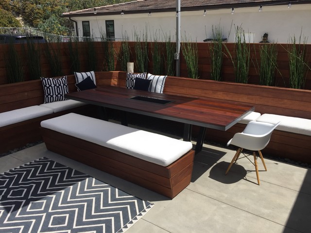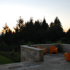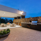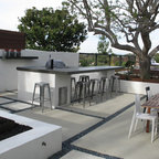 Cette image montre une terrasse et balcon minimaliste avec des pavés en béton. — Houzz