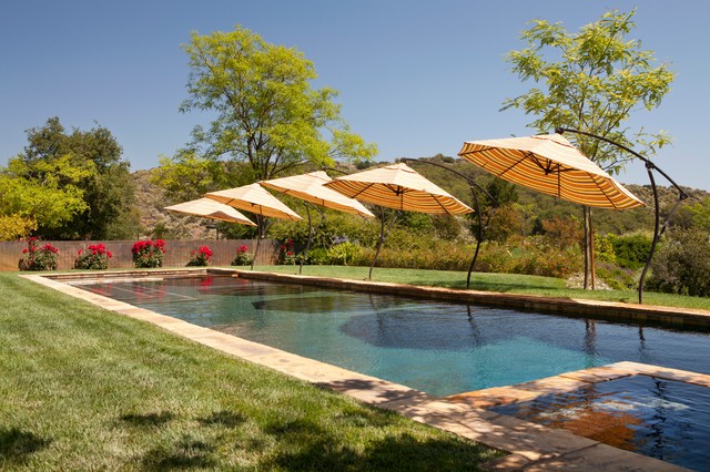 Exemple d'une grande piscine méditerranéenne rectangle. — Houzz