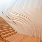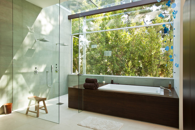 lots of glass, light green tile with dark wood