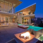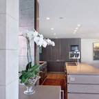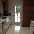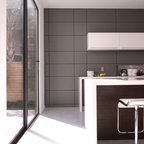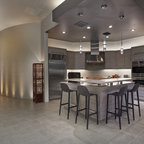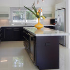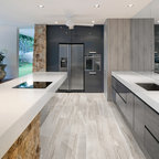 Réalisation d'une cuisine ouverte design avec un sol en carrelage de porcelaine, un placard à porte plane, des portes de placard en bois clair, un électroménager en acier inoxydable et un îlot central. — Houzz