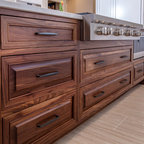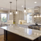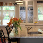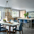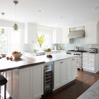 Inspiration pour une cuisine américaine parallèle traditionnelle avec un évier encastré, un placard à porte shaker, des portes de placard blanches, une crédence blanche, une crédence en mosaïque, un électroménager en acier inoxydable, un sol en bois brun, un îlot central, un sol marron et un plan de travail blanc. — Houzz